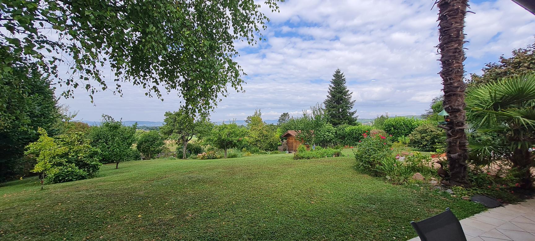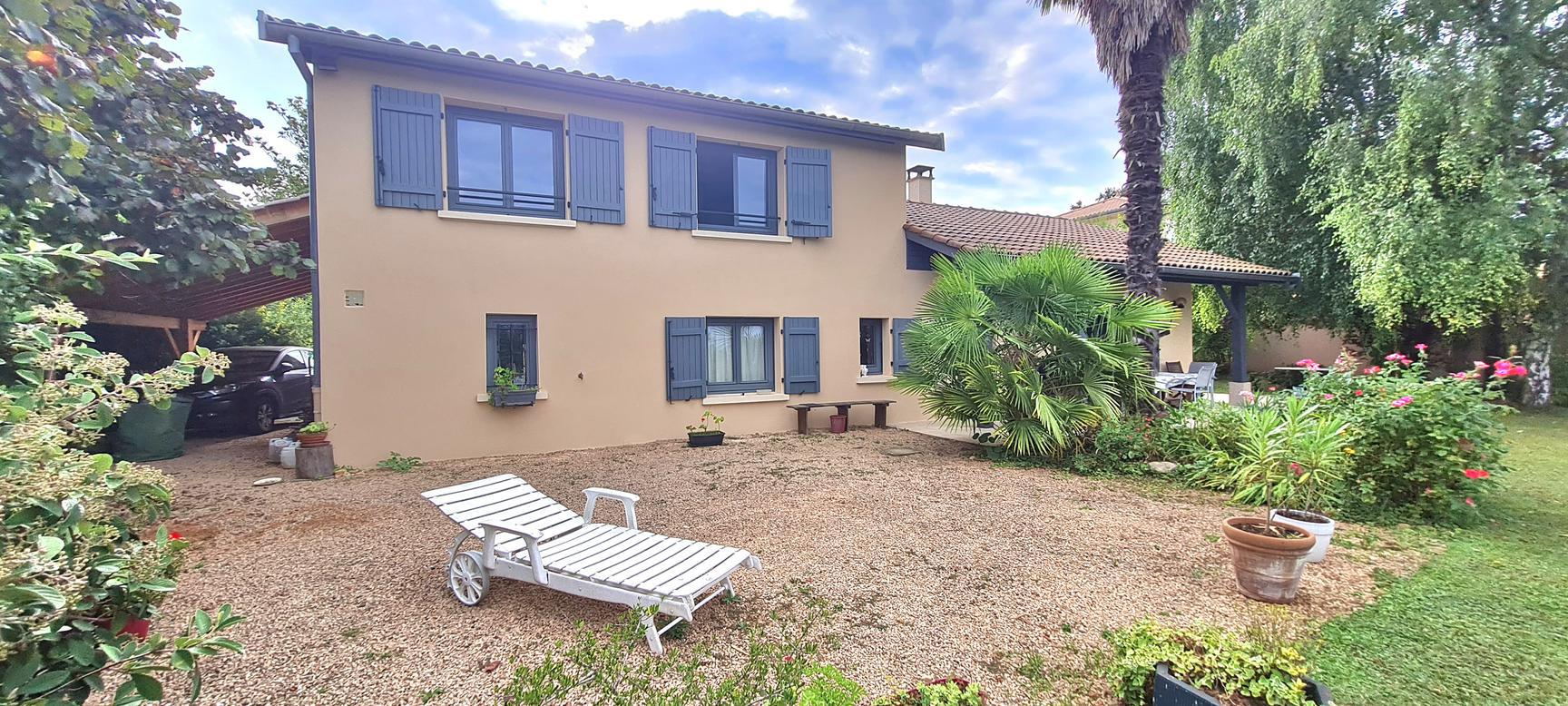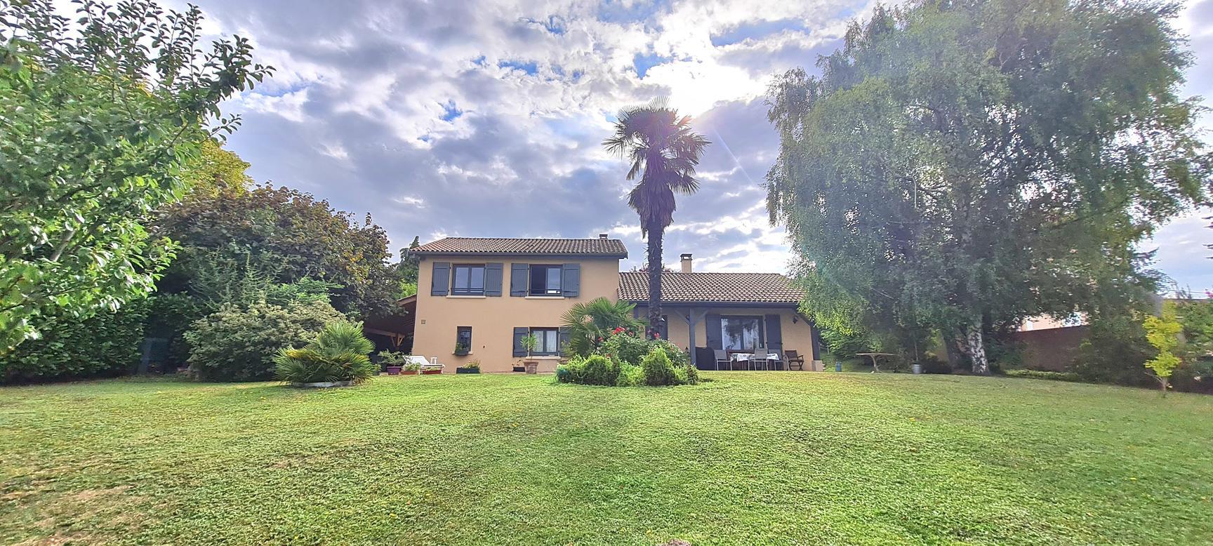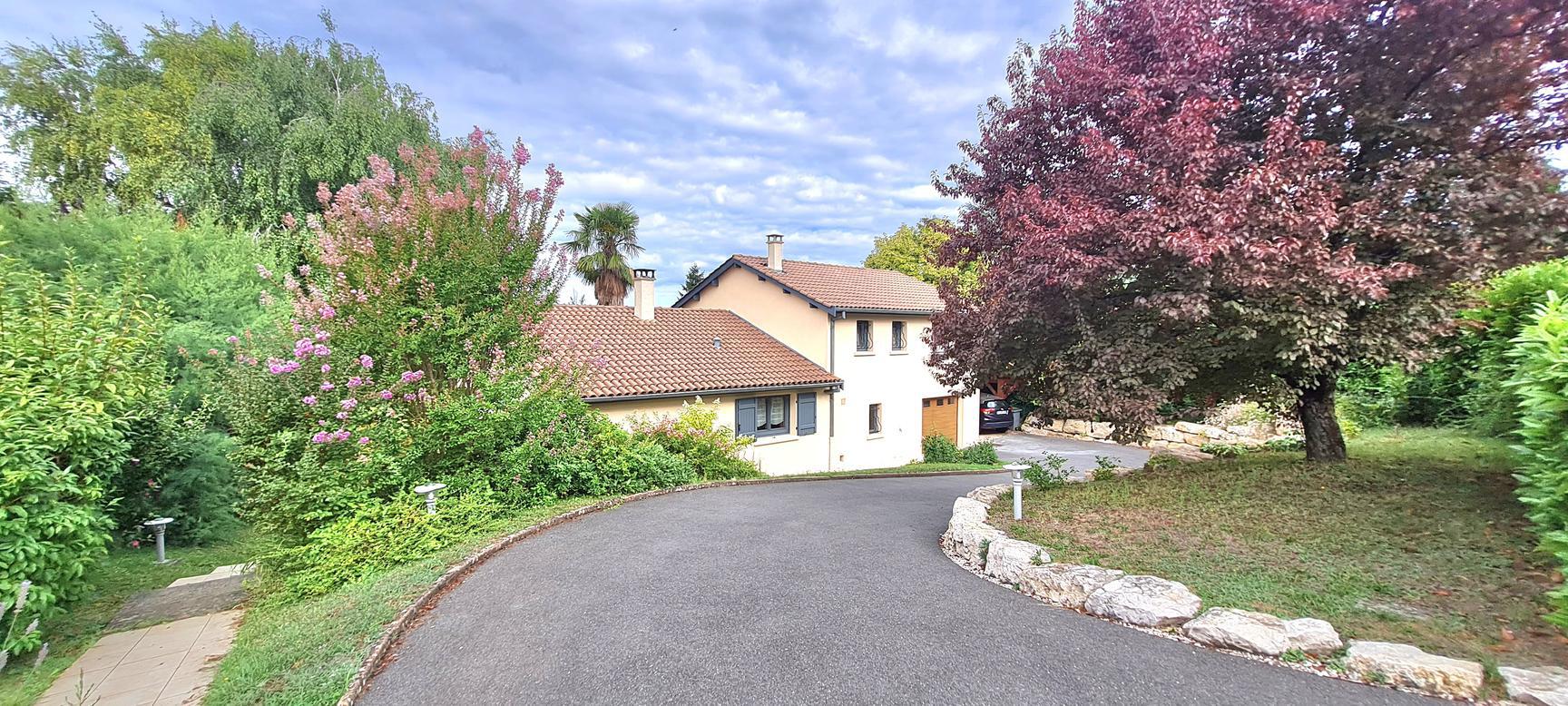 Sur les hauteurs de Reyrieux : venez découvrir dans un environnement calme et verdoyant, offrant une vue dégagée et sans vis à vis, cette charmante maison de 121 m² habitables + annexes 41 m² (garage, atelier et cave), carport de 18 m², 2 places de stationnement sur un joli terrain de 1531 m² ( + chemin d'accès 183 m²) arboré et végétalisé avec soin.