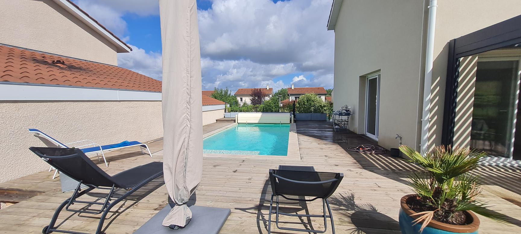 Sur la commune de Toussieux à 5 minutes de Reyrieux : au calme, offrant une vue dégagée sur la nature côté Sud : venez découvrir cette fonctionnelle et lumineuse maison de 91 m² (4 chambres) avec buanderie, garage et 4 places de stationnement sur une parcelle de 508 m² agrémenté d'une piscine avec sa plage, de deux terrasses, dont une avec pergola et d'un jardin engazonné.