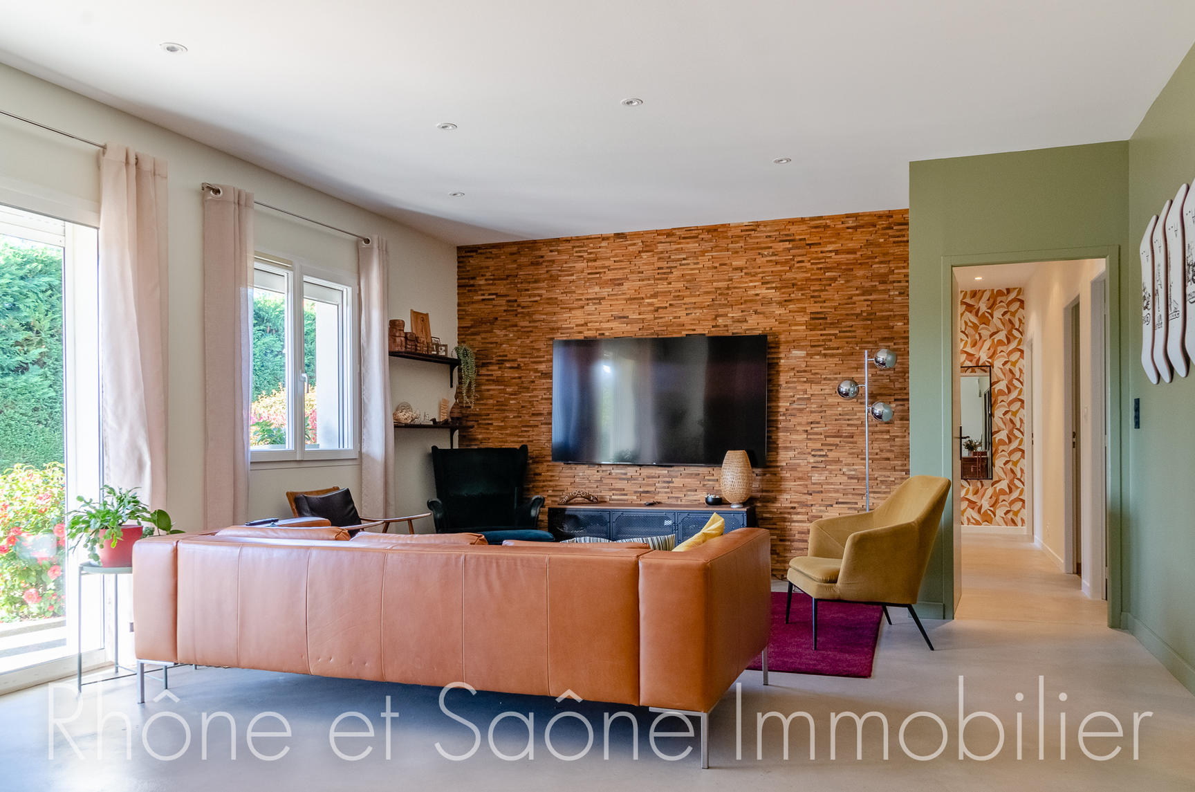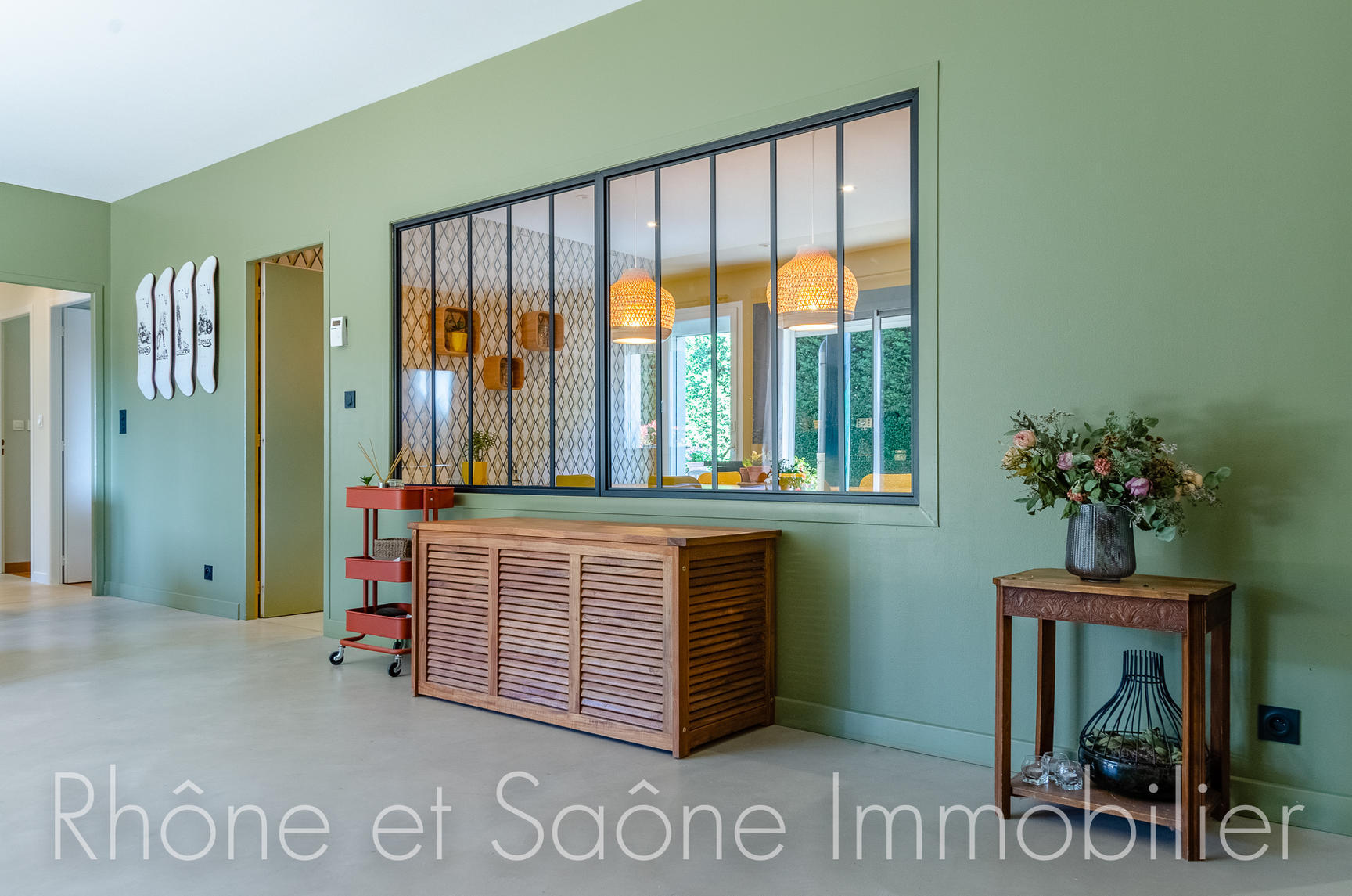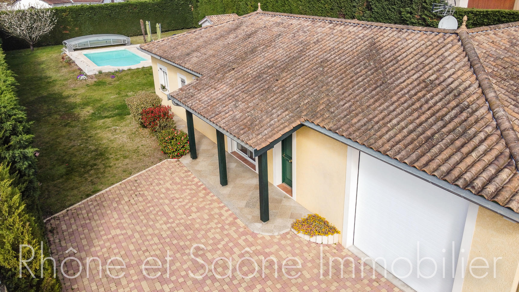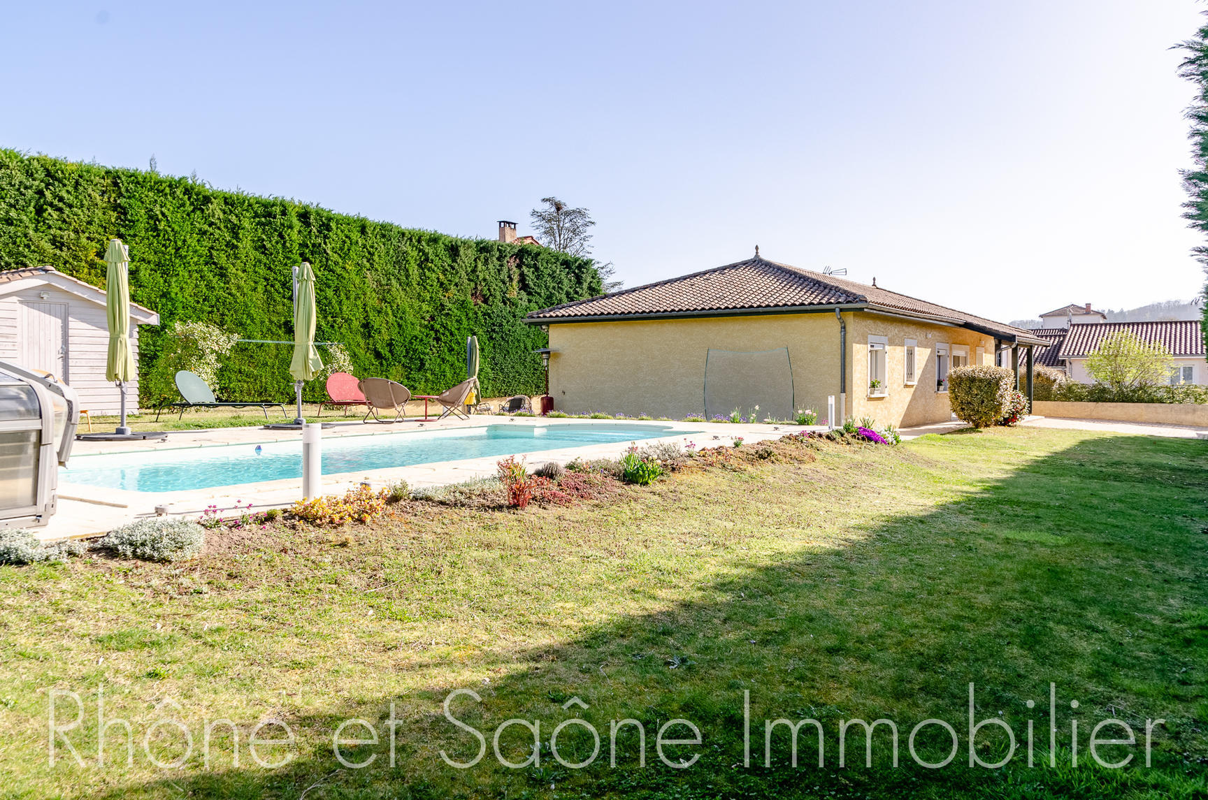 Rare sur Reyrieux, au calme et sans vis à vis, à 3 km de l'entrée d'autoroute A 46, à proximité du Collège et arrêt de cars pour Lycée, à 10 minutes à pied des commerces : coup de cœur assuré pour cette maison très agréable à vivre, aucun travaux à prévoir, état impeccable, vie de plain-pied : 152 m² habitables offrant une belle pièce de vie ouvrant sur une cuisine avec verrière, aménagée et équipée très fonctionnelle, 5 chambres, 2 pièces d'eau, 2 wc, un grand garage (32,10 m²) et 5 places de stationnement, sur un terrain clos, arboré et végétalisé de 1 501 m² (dont chemin d'accès 300 m²) avec piscine sécurisée par son dôme, local technique et puits.